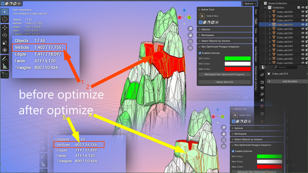 Non-Optimized Polygon Inspector Addon for Blender 3D visualizes which polygons are non-optimized high-polygons in a Blender scene. Red polygons indicate high-polygons that are non-optimized, while green polygons indicate low-polygons, depending on the scene's polygon count. This addon helps you identify non-optimized high-polygons in your Blender scene.